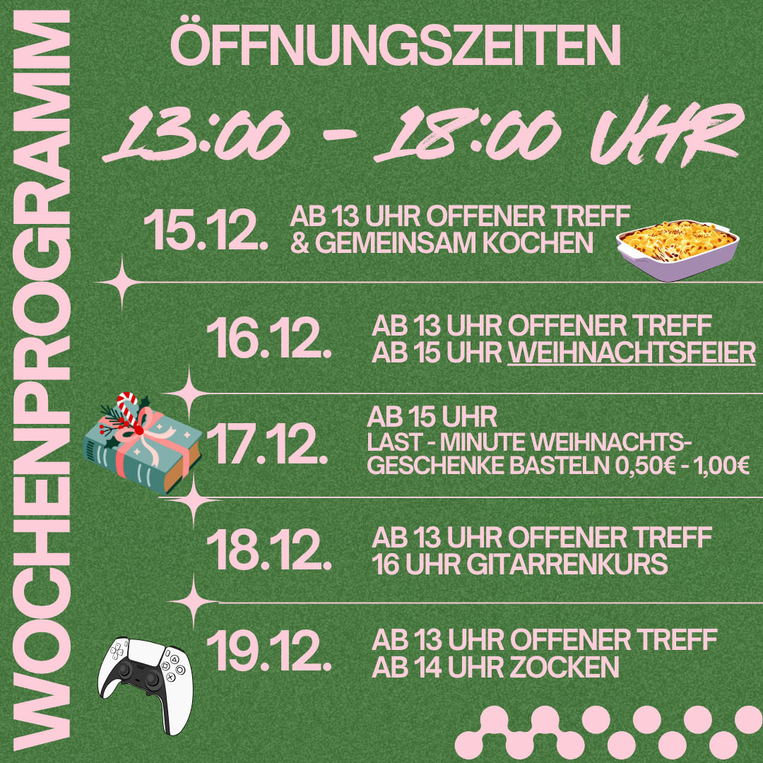 Hier kommt unser Programm für die nächste Woche! 🕐 Öffnungszeiten: 13:00–18:00 Uhr Montag 15.12. – Ab 13 Uhr offener Treff & gemeinsam kochen (Brokkoliauflauf)🥦🍣 Dienstag 16.12. – Ab 13 Uhr offener Treff; ab 15 Uhr Weihnachtsfeier 🎄 Mittwoch 17.12. – Ab 15 Uhr Last‑Minute Weihnachtsgeschenke basteln (0,50€–1,00€) ✂️🎁 Donnerstag 18.12. – Ab 13 Uhr offener Treff; 16 Uhr Gitarrenkurs 🎸 Freitag 19.12. – Ab 13 Uhr offener Treff; ab 14 Uhr Zocken (PlayStation) 🎮😎 Wir freuen uns auf euch!!! 💚✨Button